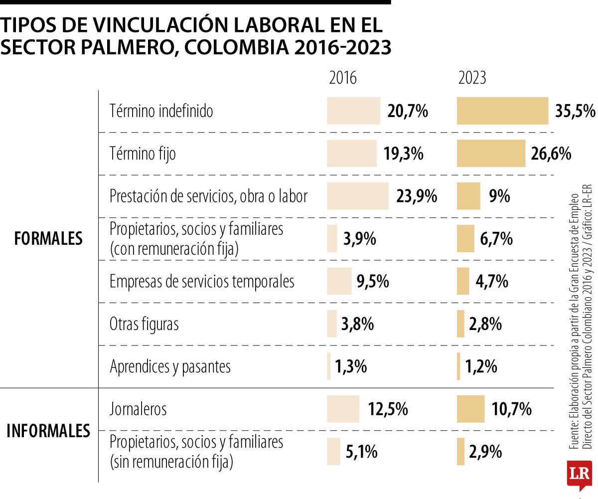 Los resultados logrados por la palmicultura en formalización entre 2016 y 2023 estuvieron mediados por esfuerzos que ha hecho el sector por reducir la figura de tercerización o intermediación y posiblemente por el apoyo recibido de la Organización Internacional del Trabajo y del Ministerio del Trabajo para promover acuerdos de contratación directa y formalización laboral.